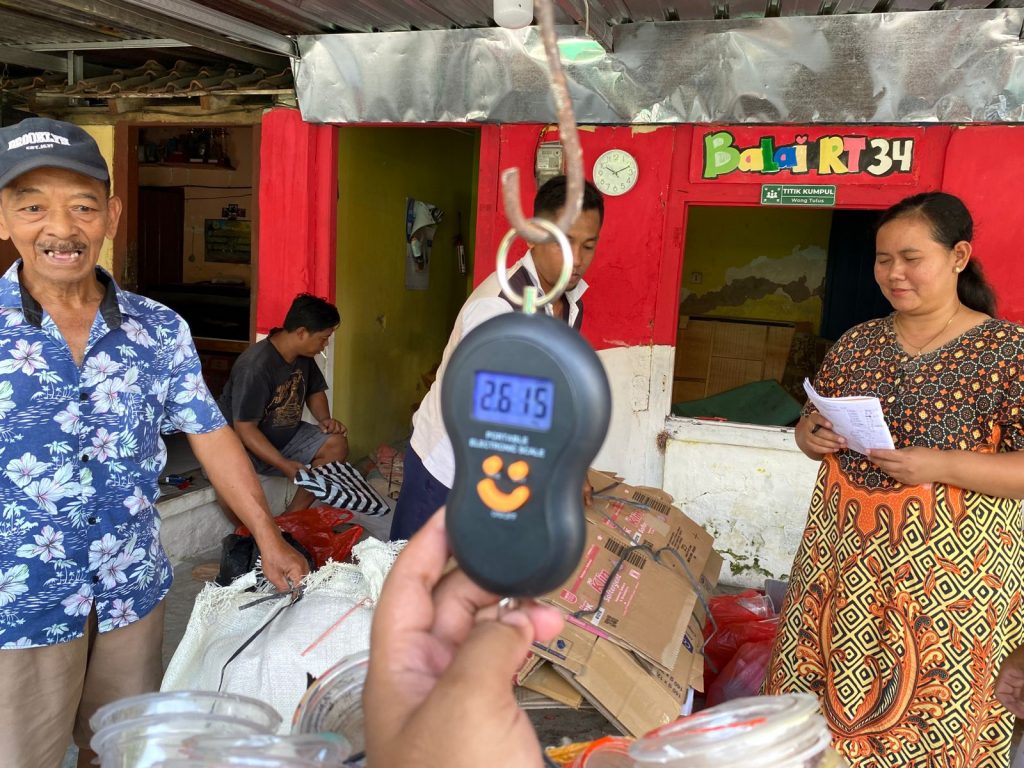 Pada kesempatan tersebut, Ibu Lurah Tri Mardiana, S.STP., M.A.P. berkunjung langsung ke Bank Sampah RT 34 untuk melihat proses penimbangan dan pengumpulan sampah anorganik yang dilakukan oleh para anggota. Kehadiran beliau disambut antusias oleh para pengurus dan warga yang terlibat aktif dalam kegiatan rutin tersebut.