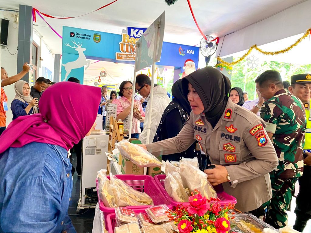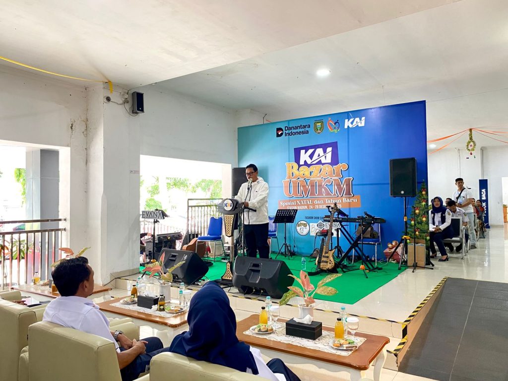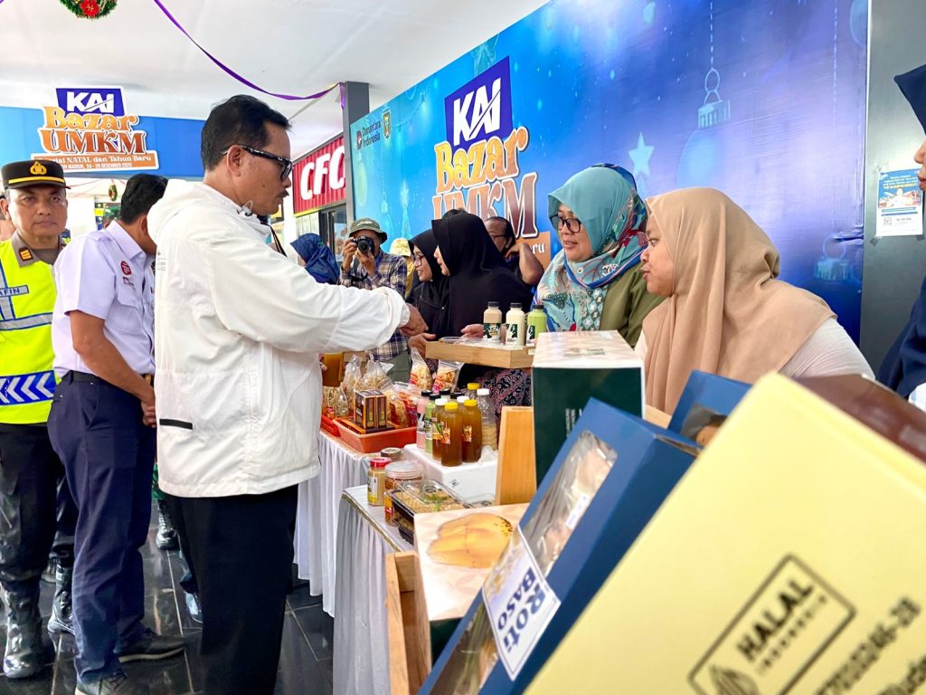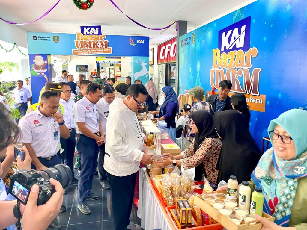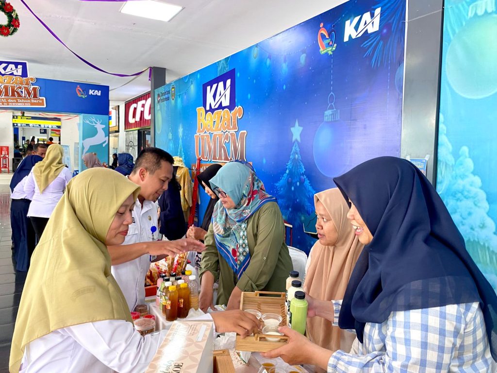 MADIUN LOR — Wisatawan yang turun di Stasiun Madiun kini langsung disuguhi beragam produk unggulan pelaku Usaha Mikro, Kecil, dan Menengah (UMKM). Hal tersebut terlihat dengan digelarnya KAI Bazar UMKM Spesial Natal dan Tahun Baru yang berlokasi di area Stasiun Madiun.